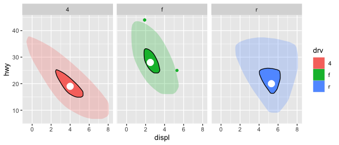 ggplot(mpg, aes(displ, hwy, color = drv, fill = drv)) +
